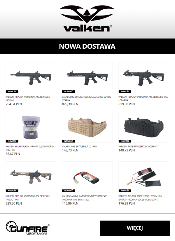 Do Gunfire dotarła dostawa od amerykańskiej firmy Valken. Znalazły się w niej akcesoria airsoftowe, takie jak maski ochronne, gogle V-Tac, kulki czy akumulatory NiMh i LiPo.