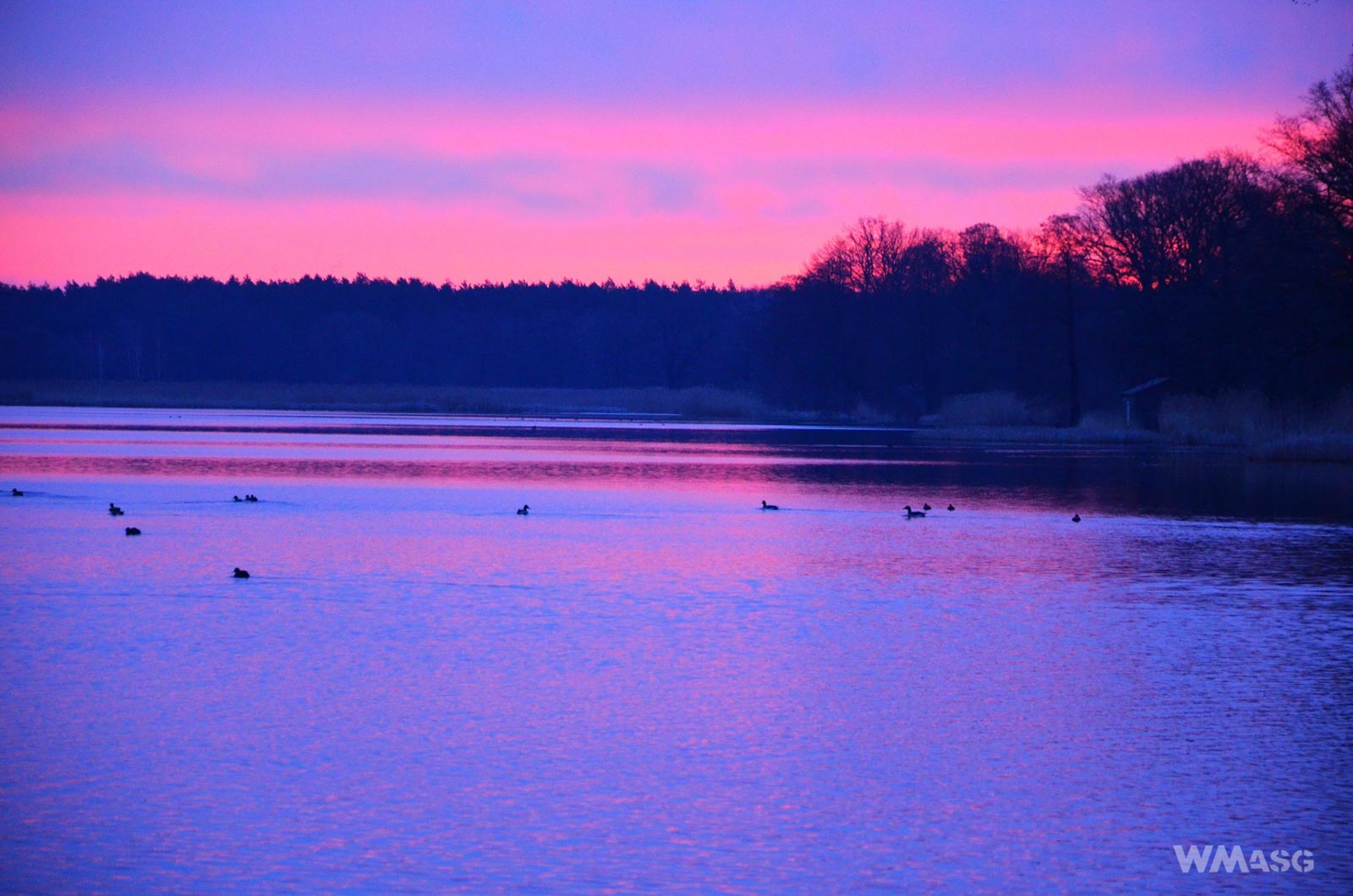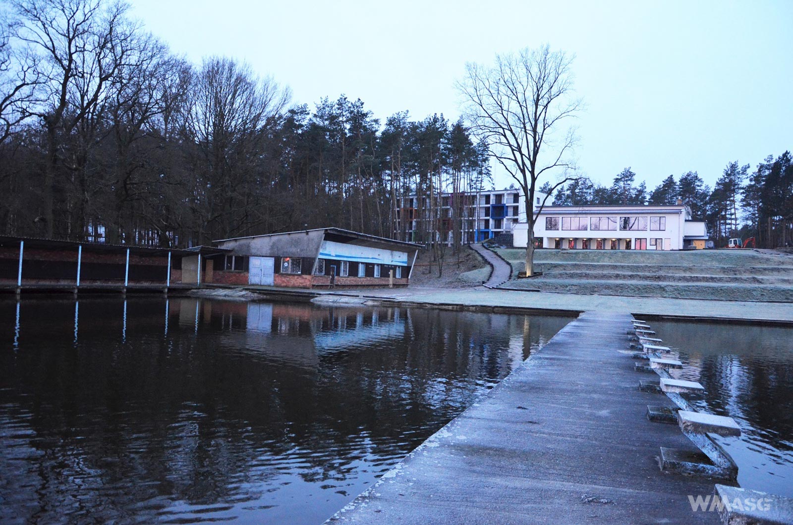 Na miejsce zbiórki dotarłem w sobotę około godziny 6:15. Nie byłem pierwszy, co oczywiste, kiedy spotkanie zaczyna się piątkową integracją. "Oblacka Przystań" - bardzo ciekawe miejsce. Z początku wydawało się puste i spokojne. Za sprawą prześwitującego za drzewami stawu Posmyk, było także bardzo ładne. Wybrałem się na nabrzeże, aby trochę się rozgrzać i rzucić okiem na krajobrazy i tysiące ptaków pokrywających taflę wody.