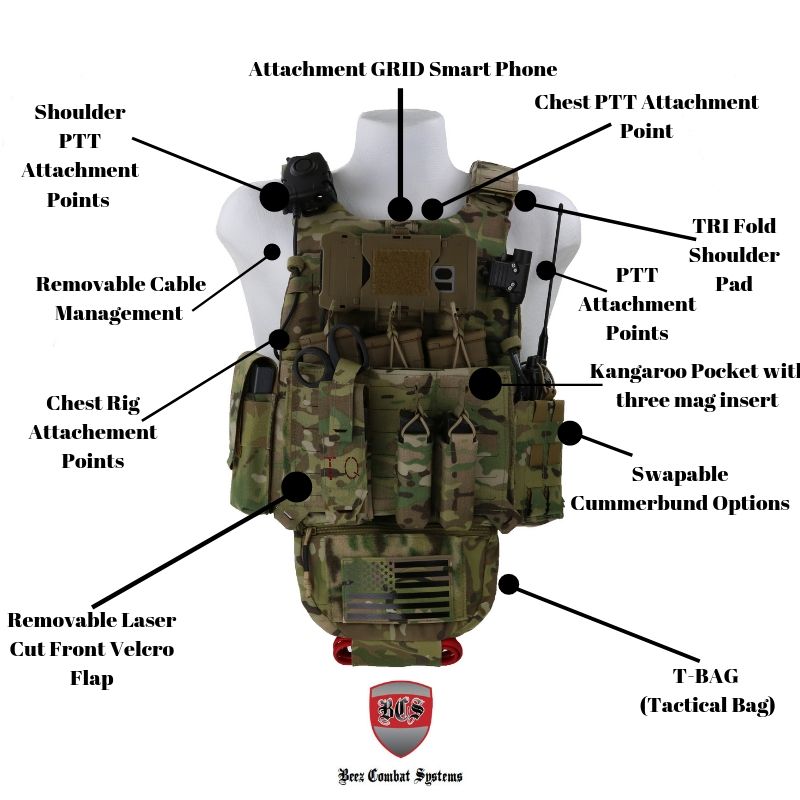 - Seryjny 4-calowy elastyczny cummerbund mieści magazynki typu  5,56/7,62 (cztery kieszenie na stronę)
